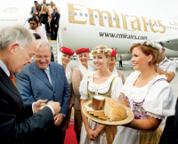 Tim Clark (left), president Emirates Airline and Richard Vaughan (right), Emirates’ divisional senior VP commercial operations worldwide arriving at Prague airport on the inaugural Emirates passenger flight from Dubai. They were greeted with a traditional Czech welcome: bread and a sprinkling of salt.