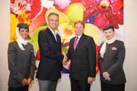 Etihad Airways announced the launch of its new Art Connect club. Seen here, Andrew Ward, Etihad Airways’ VP marketing (right) and Bertrand Epaud, director of Opera Gallery Middle East (left) at the launch of the new club membership, linked to its loyalty programme Etihad Guest, offering opportunities to enjoy masterpieces in the skies and on the ground.