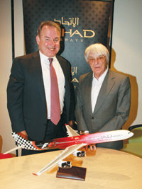 Etihad Airways and the Formula One Group signed an agreement extending the airline’s title sponsorship of the Formula 1 Etihad Airways Abu Dhabi Grand Prix for four years, effective through to the 2015 event. Seen here, James Hogan, Etihad Airways CEO, and Bernie Ecclestone, Formula One Group CEO.