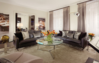 The spacious yet homely living room has comfortable sofas and large windows with a courtyard-facing balcony, creating a light and airy ambience. One wall is covered in Italian leather, embedded with a 42-inch television and the modern and minimalist clean-fuel fireplace and the suite offers the best in sound systems (Denon and Creston), with Blu-ray DVD player, iPod docking station and Sonance ceiling speakers throughout.
