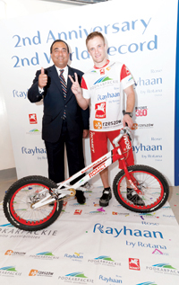 Rose Rayhaan by Rotana Dubai, the world’s tallest hotel as declared in the Guinness Book of World Records, celebrated its second anniversary with renowned Polish cyclist Krystian Herba who created a new world record for Stair Climbing by Bicycle by conquering 2,040 steps of the iconic hotel in 1 hour, 13 minutes and 41 seconds. Seen are Herba with general manager Daniel Matthew.