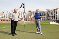 Global golf legend Colin Montgomerie ruefully acknowledges a missed hole-in-one on Saadiyat Beach Golf Club’s par-3 sixth hole which separates the ocean from the new St. Regis Saadiyat Island Resort. Montgomerie was in Abu Dhabi for a Starwood Preferred Guest golf clinic. Also in the picture is John Pelling, general manager of the resort, which promises an overnight stay for anyone who aces the sixth hole on the course.