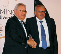 Amine Moukarzel (left), president of Golden Tulip Mena, was awarded for his achievements and development of the Golden Tulip Hotels in the Middle East & North Africa by receiving a Platinum Award from the CEO and president of Louvre Hotels Group Pierre Frederic Roulot.