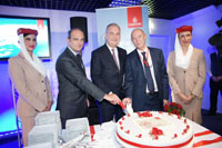 Seen here: At the ceremonial cake cutting event at Lyon Airport to celebrate the first Emirates service into Lyon pictured from left to right are Thierry Aucoc, France area manager, Thierry Antinori executive vice-president passenger sales worldwide and Philippe Bernand, CEO Lyon Airport.