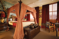 From the leather Chesterfield to precious glassware, intriguing art and antique rugs, world arts and crafts are displayed throughout. Each wall is a work of art in itself, with striking Nina Campbell wallpapers in burnt orange, black and red, laden with curios collected from over 32 different cultures. Sumptuous silk drapery meets magnificent oak flooring, while priceless antique furniture displays ornaments such as rare Chinese porcelain, Bhutanese frames and 1920s embroidered Indian lamps.