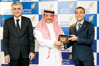 Gulf Air earned the prestigious ISO certification for its information security management system. Seen here, Maher Salman Al Musallam (centre) Gulf Air acting chief executive officer receiving the ISO certificate from Andrea Di Bella, RINA Group Middle East area manager (right) and Dr. Jassim Haji, Gulf Air director information technology.