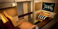 The Diamond First Class suite, designed to provide enhanced privacy, higher levels of comfort and more personal space, features a 57-inch-high sliding screen door. The seat is upholstered in world-renowned Poltrona Frau leather with an inbuilt massager and unfolds into a fully flat bed.
