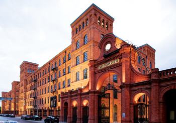 The entrance to Manufaktura, a shopping and recreation complex, and a glimpse of andel’s Hotel Lodz |