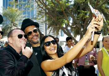 Lead singer, artist and song writer Ali Campbell along with friends Astro and Mickey at the British Airways VIP Lounge at Taste of Dubai 2015. The UB40 trio wowed VIP lounge guests, British Airways executives and corporate customers with British reggae-pop music.