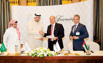 Fairmont Hotels & Resorts and Sisban Holdings have announced the signing of a new 350-room luxury hotel in Jeddah, Kingdom of Saudi Arabia. The new hotel is scheduled to open in late 2018. Pictured at the signing, from left to right: Dr Abdulrahman Almufarreh, Sisban group chief executive officer, Ali Al Sharif, Sisban president and co-founder, Michael Glennie, FRHI president and COO, and Francois Baudin, FRHI senior vice-president development.