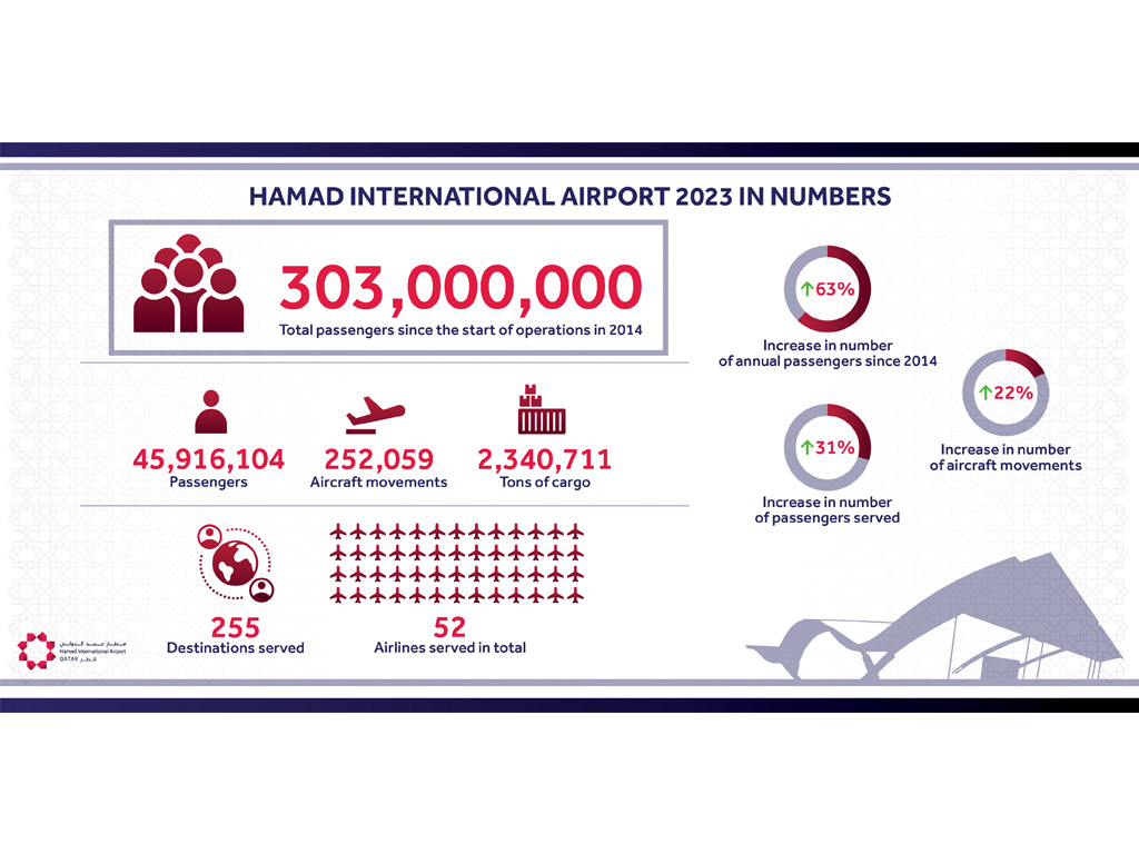 Closing out 2023 with outstanding accomplishments and new milestones, the award-winning airport surpassed all expectations by serving 45.9 million passengers, a remarkable 31 percent increase compared to 2022. The airport serves as the base for the national carrier, Qatar Airways, and is operated by Qatar Airways Group.