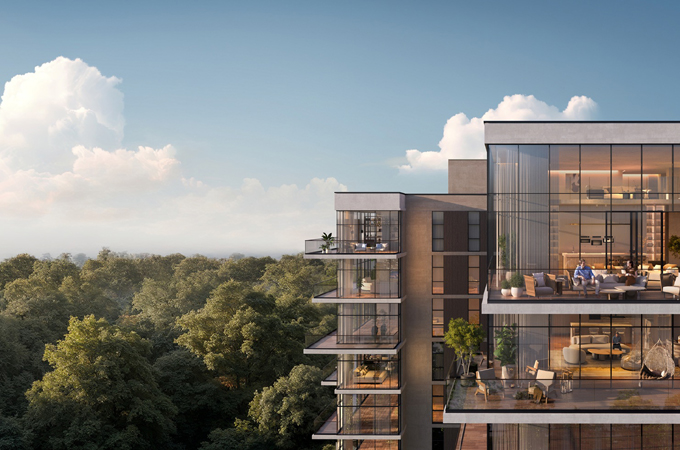 The development extends across 25,000 sq m while providing only 96 residences across four boutique buildings, creating a private and peaceful environment. Each building features four homes per floor, with a single elevator serving two units per level to maintain exclusive access. The development includes two- and three-bedroom apartments, as well as four-bedroom duplexes, which offer perfect views and direct accessibility to the forest.