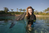 Actress Mischa Barton poses in the Aquaventure water park with a dolphin. Barton was in town for the landmark grand opening of Palm Atlantis Resort and Palm Jumeirah.