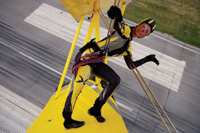 Cerina Rydälv, one of the star attractions at the Al Ain Aerobatic Show performs on the wing of a speeding plane as ‘Skycat’, part of the Scandinavian airshow display team at Al Ain International Airport