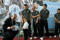 Manchester City FC manager Mark Hughes meets a young fan watched by Gareth Barry, Stephen Ireland, Roque Santa Cruz and Carlos Tevez during a visit to Abu Dhabi en route to South Africa where they will take part in a pre-season tour. The players also visited its training academy and had a special session learning to fly in an A320 full flight simulator
