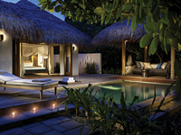 From the 10 private over-water pavilions and villas built on stilts, guests can see directly below into the waters of the turquoise lagoon. The spacious interior features tasteful living and dining areas, overlooking the private pool. The bedroom, adjacent to the living room has floor-to-ceiling glass and wood doors which slide back to reveal the private deck.