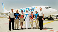 flydubai’s CEO Ghaith Al Ghaith (centre) and chief pilot David Ray (far right) together with flydubai cabin crew and flight deck crew take delivery of the airline’s seventh aircraft in just 10 months of operations. The aircraft will be put into service on the new Muscat and Kuwait City routes.