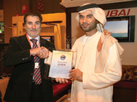 Abdullah Suwaidan, deputy director overseas promotions, Dubai Department of Tourism Commerce Marketing, receives an award from Manuel Matellan, manager of El Club del Buen Turismo, at the Dubai Stand at the Fitur-2010 exhibition held in Madrid recently.