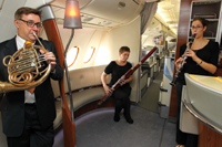To celebrate Emirates’ 10th anniversary of flights into Sydney, Emirates invited long-term partner, the Sydney Symphony, to entertain passengers on its Airbus A380 trans-Tasman flights with a three-piece ensemble performance. Left to Right: Robert Johnson, Alexandra Carson and Chloe Turner.