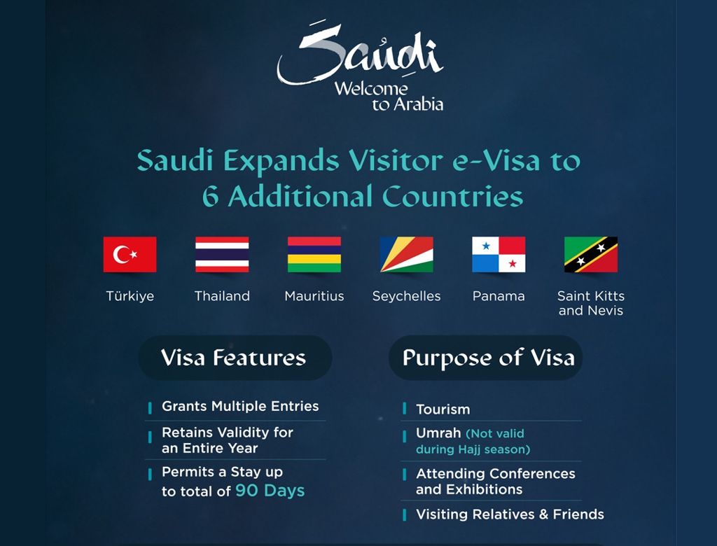 Saudi Arabia has expanded its e-visa programme to travellers from six additional countries – Türkiye, Thailand, Panama, Saint Kitts and Nevis, Seychelles, and Mauritius - for leisure, business, and religious (Umrah only) travel.