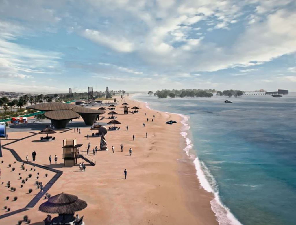 The plan includes a 2 km open swimmable beach, a 2.5 km diving sports area, a walkway with viewing platforms to blend with the surrounding environment, and recreational and service areas for beachgoers of all ages, including kids play zones, sports and marine activity areas. The beach will be connected with integrated infrastructure, including a two-lane road in each direction, parking for 1,000 vehicles, 80 bicycle racks, a cycling track, and a 5 km running track.