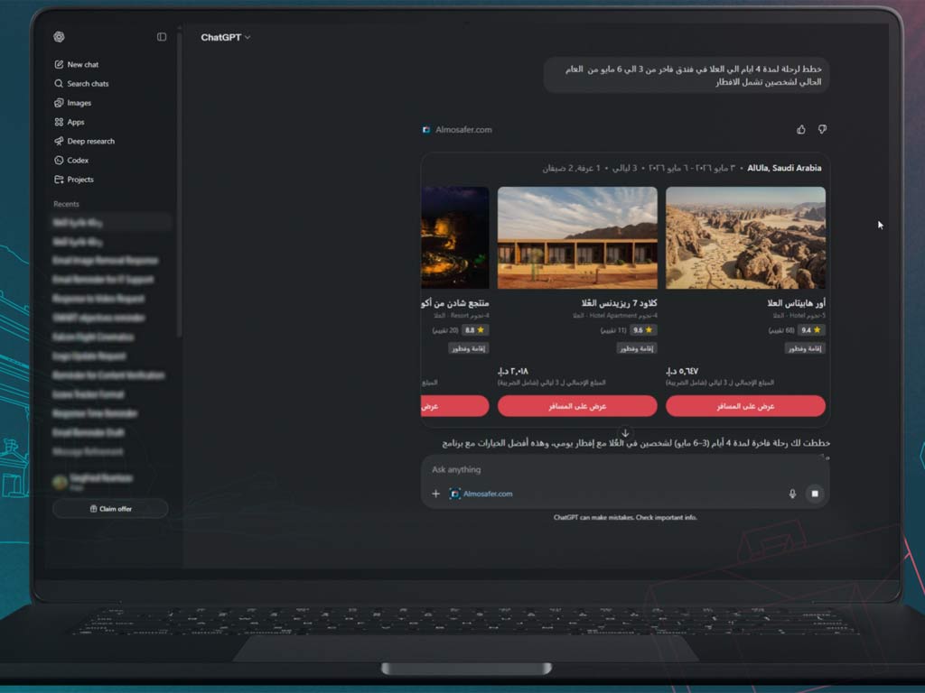 This milestone establishes Almosafer as the national leader in conversational commerce by meeting consumers directly within the world’s most advanced AI ecosystem, redefining the travel experience.Through this launch, Almosafer is transforming travel planning from a manual search process into a seamless, natural conversation. Users can now access Almosafer’s vast inventory of over 1.5 million hotels directly through the Almosafer App within the ChatGPT platform. By engaging in dialogue in both Arabic and English, travellers can instantly search for properties, receive personalised hotel recommendations, and build intricate multi-city itineraries. This integration enables a highly intuitive inspiration and planning phase, where the AI understands specific nuances - such as family-friendly requirements or proximity to local landmarks - delivering a tailored booking journey without navigating traditional menus.The experience is designed to feel intuitive and personal, as the AI understands the specific nuances that matter to you - whether that’s finding a perfect family-friendly retreat or a hotel steps away from a local landmark. As the first Saudi entity to bring these consumer services into the ChatGPT ecosystem, Almosafer is leveraging a global AI framework to replace manual clicks with real-time, contextual recommendations. From the first spark of inspiration to the final booking and transaction, your entire trip is shaped through a seamless dialogue that transforms complex planning into a simple, guided discovery of the Kingdom and the world.Muzzammil Ahussain, Chief Executive Officer, Almosafer Travel & Tourism Co., said: “Being the first app in Saudi Arabia to launch on the ChatGPT platform is a landmark achievement for Almosafer and the Kingdom’s digital economy. Our priority has always been to simplify travel through innovation, and by bringing our services to this AI platform, we are making travel planning more accessible and intelligent than ever before. We are proud to lead this charge in Saudi Arabia, ensuring we embrace the future of AI.” The Almosafer App is now live and available to users, reinforcing the brand’s position as a national champion for tourism. This initiative directly supports the goals of Saudi Vision 2030 by driving digital transformation and establishing the Kingdom as a global hub for advanced technology and world-class tourism services. - TradeArabia News Service